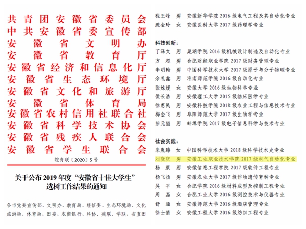 为深入学习贯彻习近平新时代中国特色社会主义思想,认真贯彻落实全国宣传思想工作会议、全国教育大会精神和团十八大精神,团省委、省委宣传部、省文明办、省教育厅等12家单位联合开展2019年度“农金杯·安徽省十佳大学生”选树工作。经过高校初评、专家评审团评审、微信投票、特邀评审团评审、公示等环节,beat365刘晓庆同学荣获“安徽省优秀大学生”称号。
