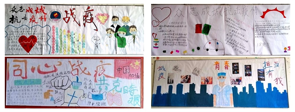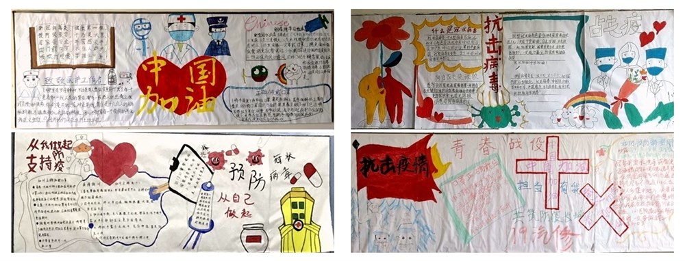 班级板报是校园防疫工作的重要宣传窗口之一。活动中,各个班级积极筹划,认真查阅、收集有关新冠肺炎的资料,精心选材并设计版面,绘制出一幅幅主题鲜明、图文并茂的疫情防控主题板报,科普了一条条抗疫知识,展示了一幕幕抗疫场景。