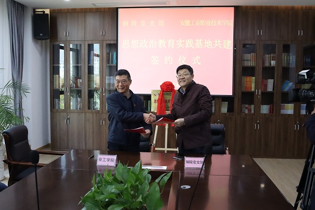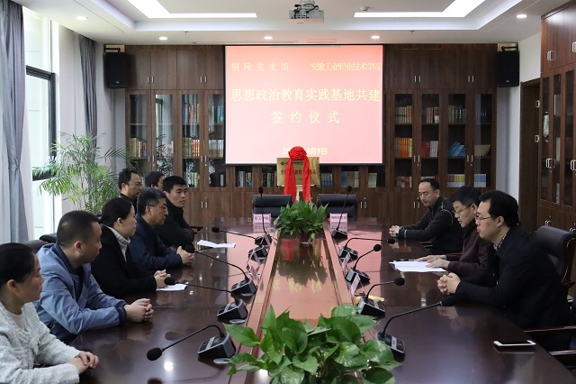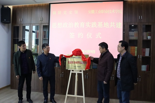 为隆重庆祝中国共产党成立100周年,深入学习贯彻习近平总书记在全国高校思想政治工作会议和学校思想政治理论课教师座谈会上的重要讲话精神,4月9日上午,学院与铜陵市党史馆共建思想政治教育实践基地签约授牌仪式顺利举行。铜陵市市委史志办研究室副主任叶明友、市委史志办综合科科长常海、学院党委书记李庆峰、党委副书记范清义、宣传统战部及部分教职工代表出席了仪式。