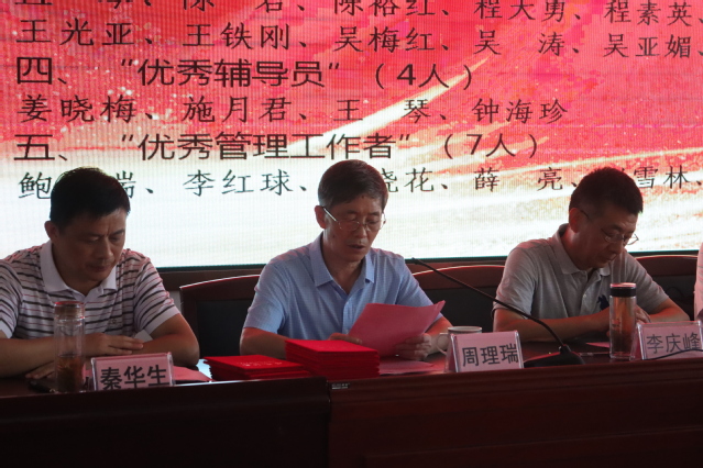 会上,学院党委委员、纪委书记周理瑞宣读了受表彰人员名单,表彰了6名“教书育人特别奖”、16名“优秀教师”、14名“优秀工作者”、4名“优秀辅导员”、7名“优秀管理工作者”。与会领导为受表彰人员进行颁奖。新进教师向“教书育人特别奖”获得者献花。