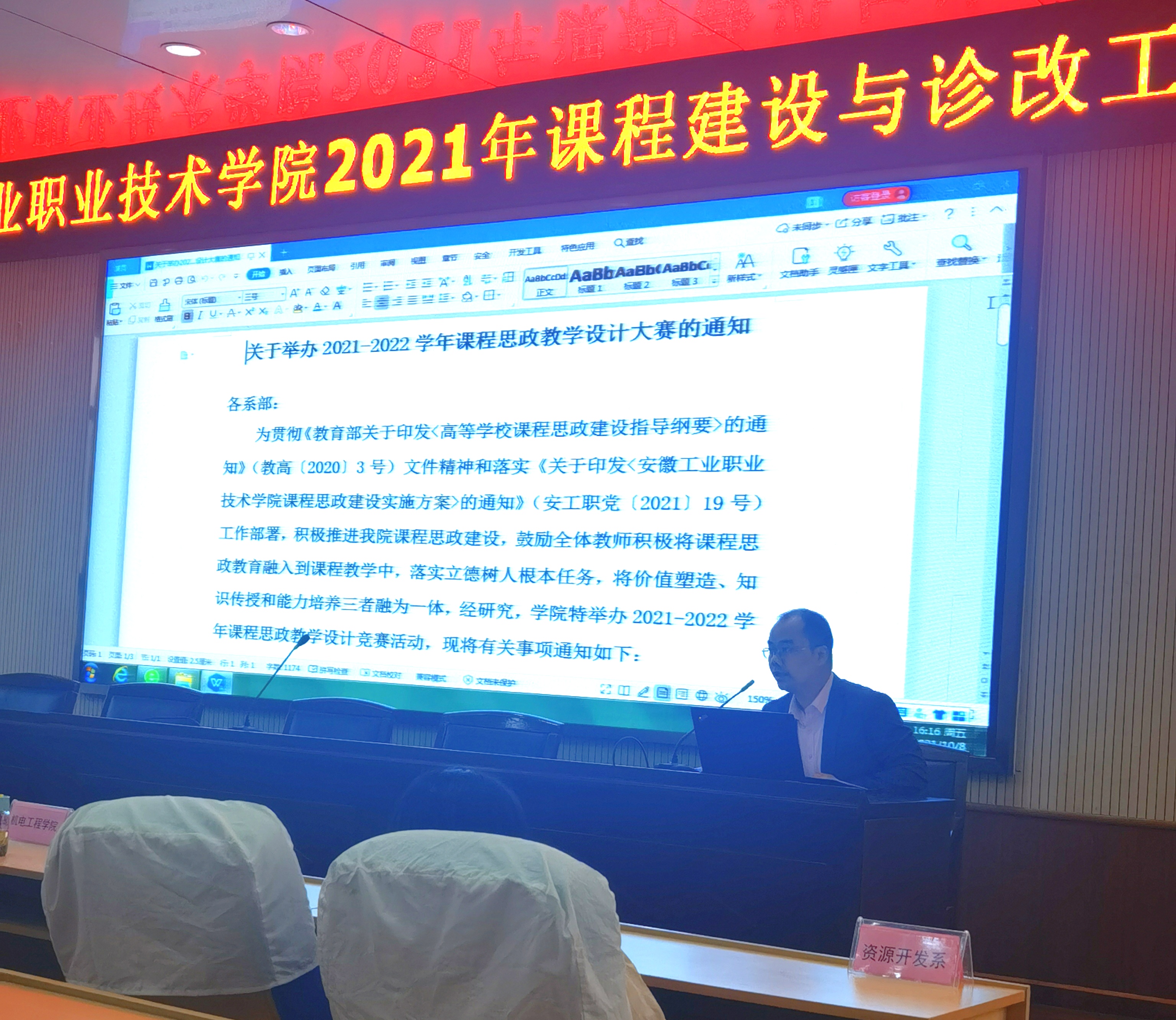最后,教务处刘处长发布了学院《2021-2022年学院课程思政教学设计大赛通知》,并从竞赛主题、竞赛内容、参赛对象、评分标准及比赛规程等方面向参会老师进行了解读。刘处长表示此项大赛亦是课程层面诊改工作的其中一项,希望各教学单位以学院诊改工作为契机,认真组织学习并落实课程建设与诊改工作,最终实现教学质量提升的目的。