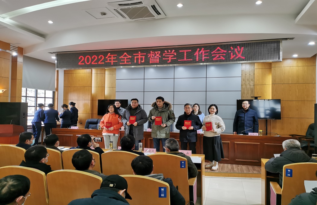 会议宣读了《2021年度铜陵市督学督导联络员挂牌督导责任区考核结果的通知》和《关于聘任苗鑫等同志为铜陵市特约督学的通知》,并为优秀代表颁奖,为特约督学颁授聘书。市直兼职督学张胜利、铜官区第八责任区组长姚根深作为优秀代表先后在会上发言。学院王小英老师获得“21年度市优秀督导联络员”称号。