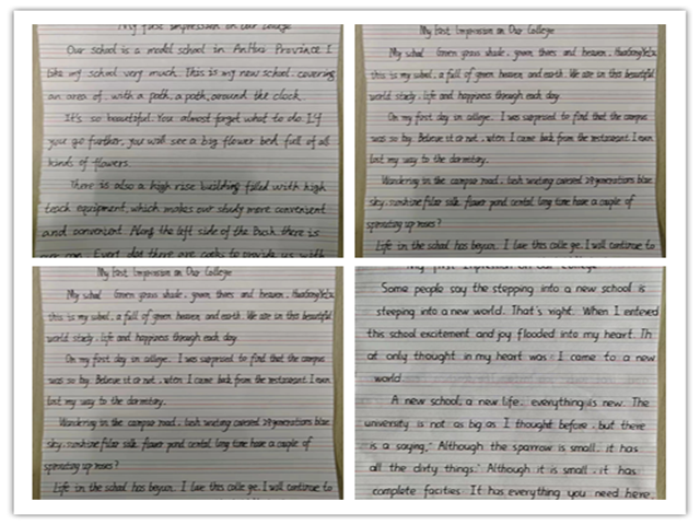 此次写作主题为“My First Impression on Our College”,参加本次比赛的学生纷纷围绕这个话题谋篇遣词,从单词、句子的运用,到语法篇章的安排,都显示出了较高的英语功底。这不仅是同学们勤学英语的结果,也是英语教师在日常教学中既注重学生英语知识的学习,又注重学生英语综合能力培养的结果。