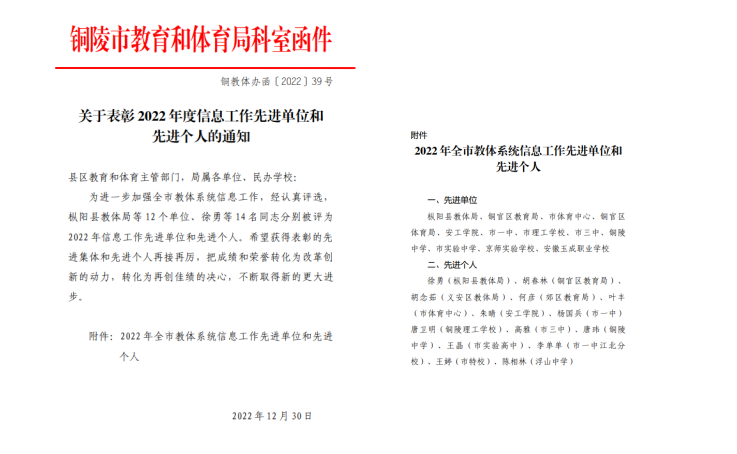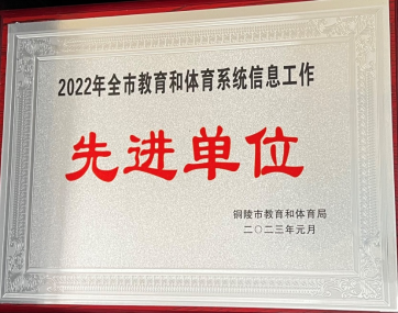 近日,接到铜陵市教体局《关于表彰2022 年度信息工作先进单位和先进个人的通知》,文件中,beat365官方网站荣获“2022年度全市教体系统信息工作先进单位”称号,beat365信息员荣获“2022年度全市教体系统信息工作先进个人”称号。
