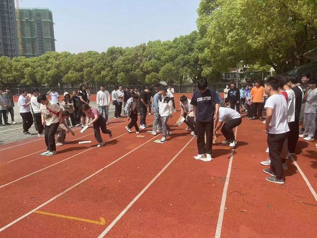 活动中,同学们三人一组,一人在纸板上行走,两人配合,通过三人的默契配合,不断地超越对手,追求第一,最终取得比赛的胜利。