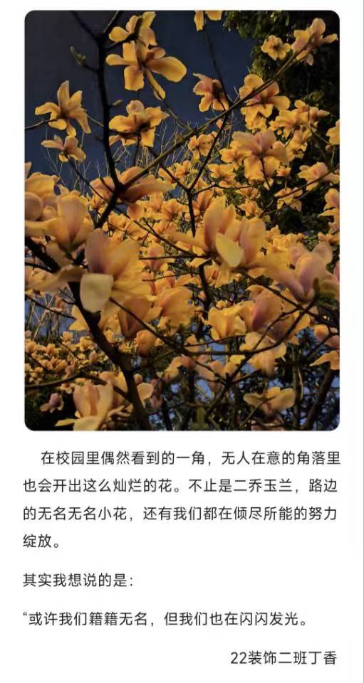 为了培养全院学生对摄影的兴趣,提高大家的审美水平,丰富大学生的课余文化生活,学院团委于4月14日在线上举办“低头见春,镜间藏美”摄影大赛。