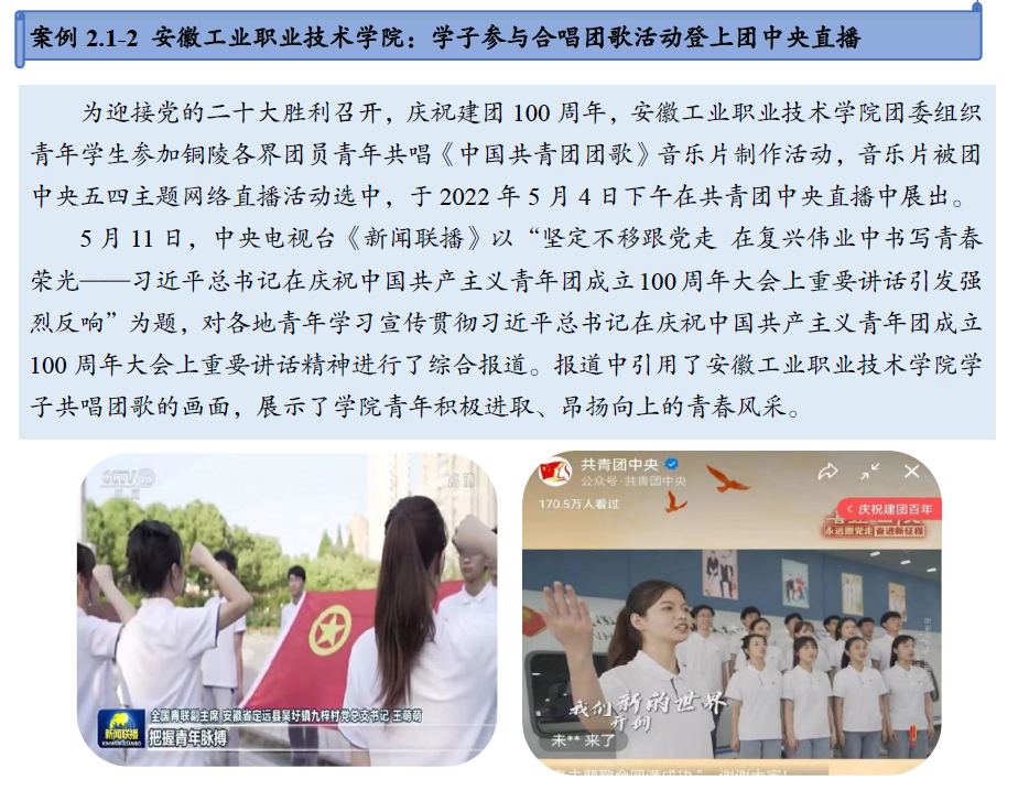 近日,在安徽省教育厅网站上公布的《2023安徽省高等职业教育质量年度报告》中,beat365《学子参与合唱团歌活动登上团中央直播》案例成功入选!