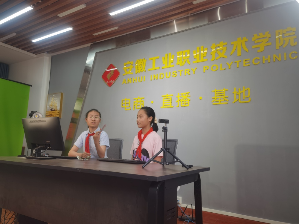 在电商直播实训室中,吴老师首先介绍了电商直播这一新兴行业和直播销售员的岗位职责,学院电商专业学生进行了现场商品直播演示,在建安小学佘校长的鼓励下,学生们积极踊跃地走上主播台模拟直播卖货,开启了他们的直播首秀。