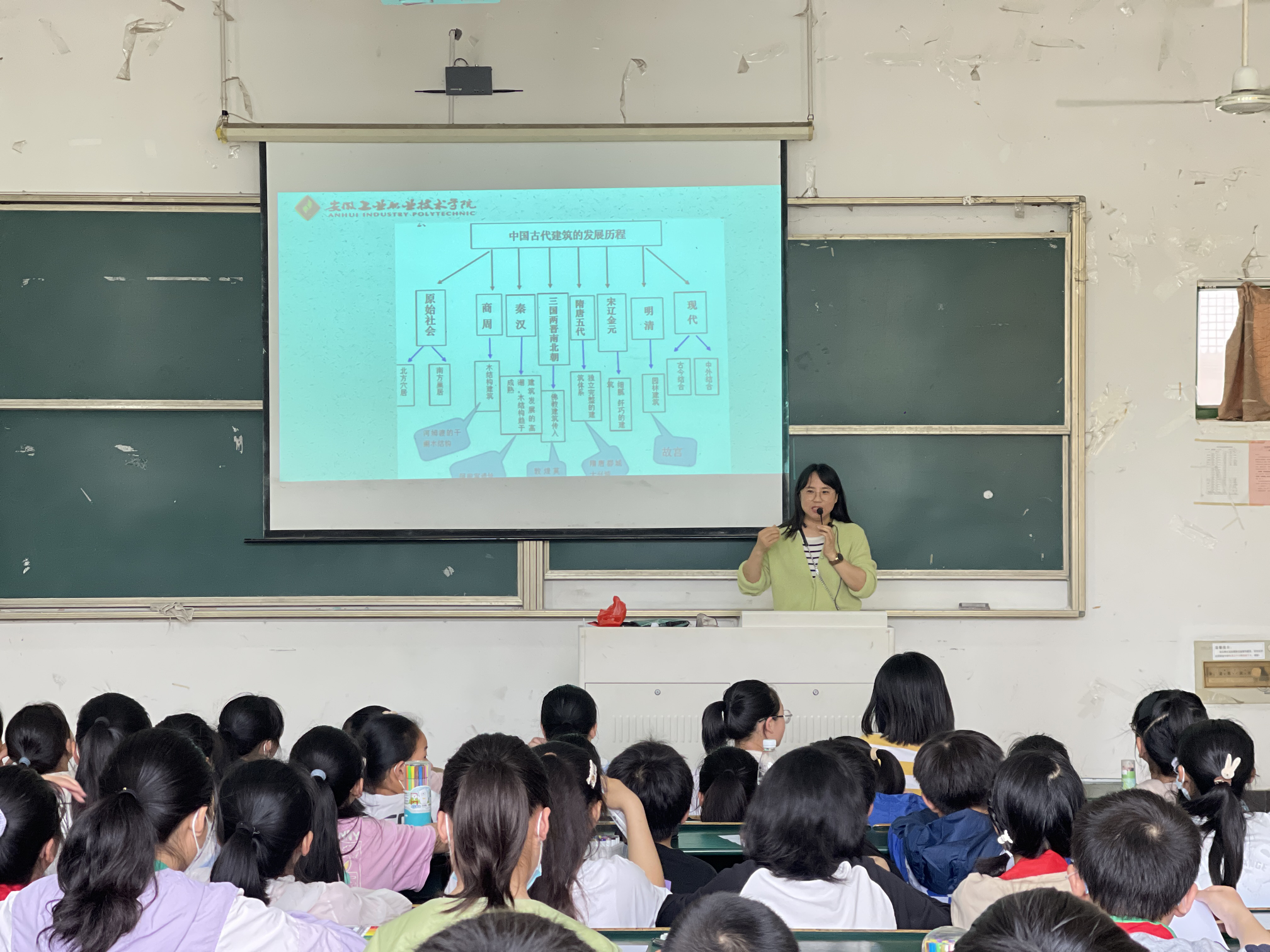 在阶梯102教室,姜老师还结合中国建筑的发展史为孩子们带来一场生动的讲座,从原始社会的巢穴到明清的故宫,详细阐述了中华文明几千年来建筑的发展史,安济桥、敦煌莫高窟、虎丘云岩寺塔、故宫等瑰丽的古代建筑让孩子们不禁惊叹古代匠人的高超手艺和精湛的技术。