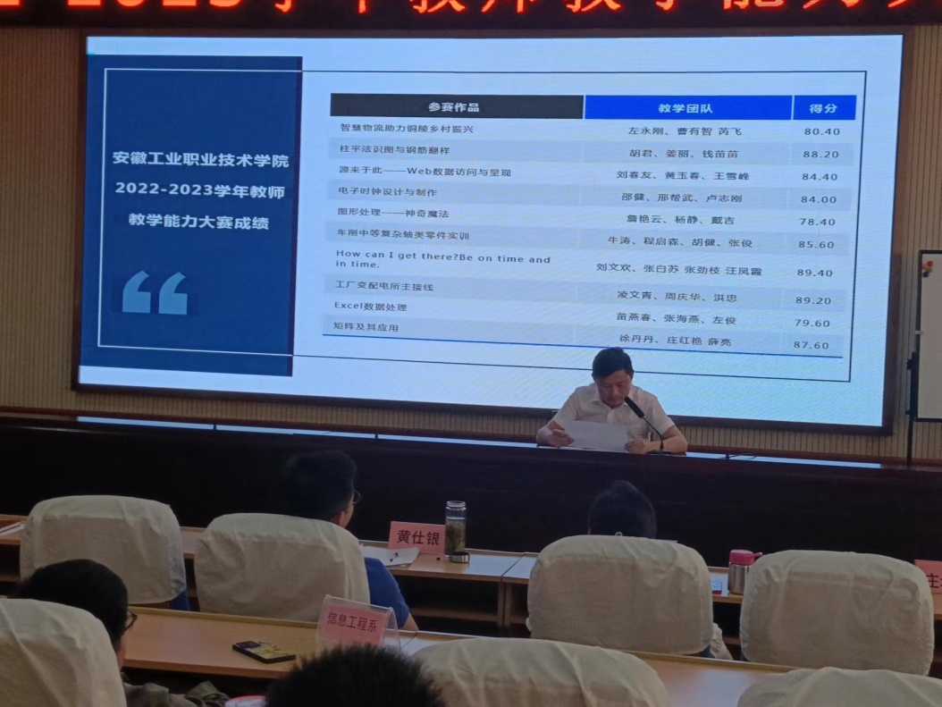 本次大赛共由10个教学团队参赛。大赛由教务处(质控处)副处长主持,王处长首先介绍了大赛议程,宣读竞赛规则与评分标准,随后10个参赛团队代表按抽签顺序依次进行教学实施报告介绍和就无学生教学展示。