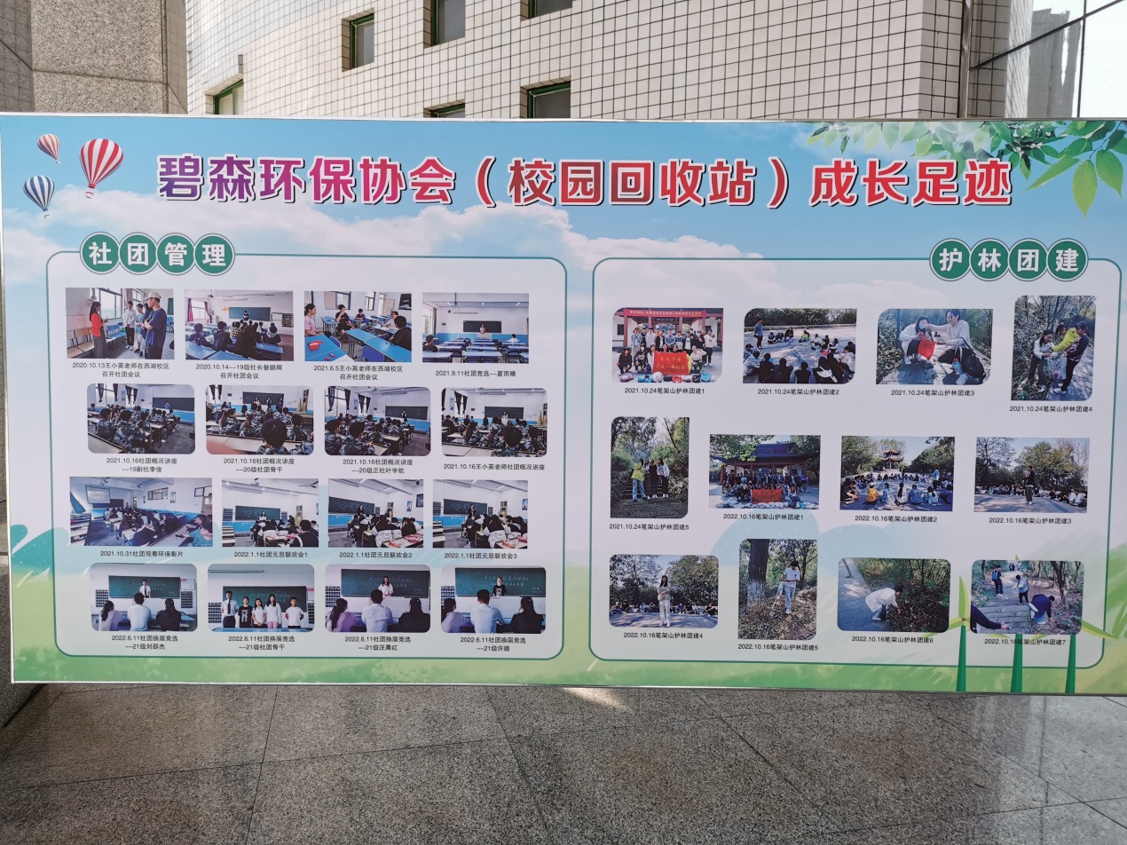 碧森环保协会为响应学院品牌创建与提升的号召,于2021年5月21日,与安徽回收郎物联科技有限公司联手创建了《校园回收站》品牌,该品牌旨在为师生处理废旧物资提供便捷高效的回收渠道,为推进绿色回收、建设无废校园贡献力量。本次成长足迹展,展示了社团自2020年秋季学期以来,开展的相关活动及取得的相关荣誉。共分为社团管理、护林团建、社团实践、参观参会、讲座竞赛、社团荣誉、校园回收及校园回收站8个模块。