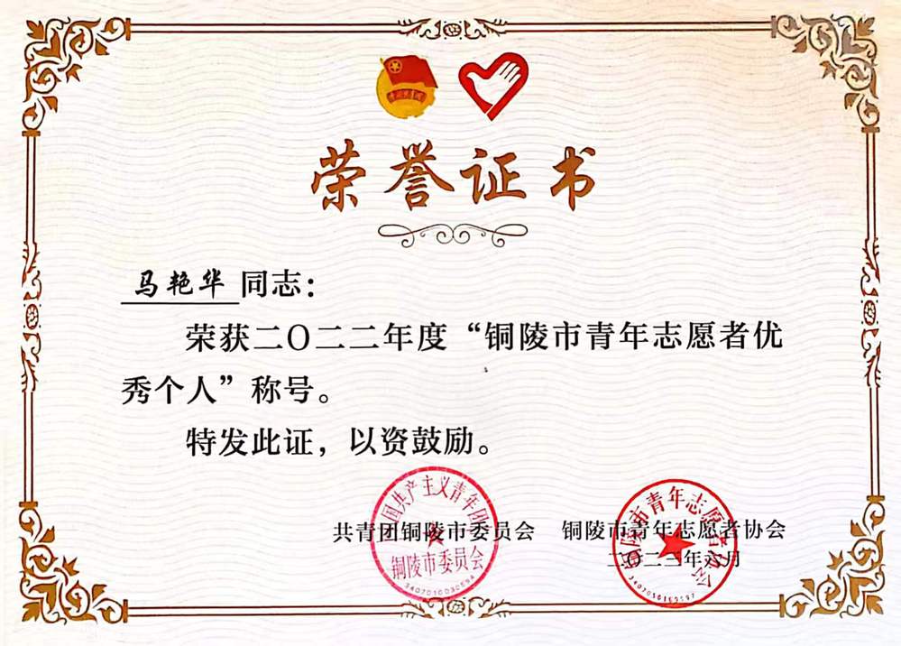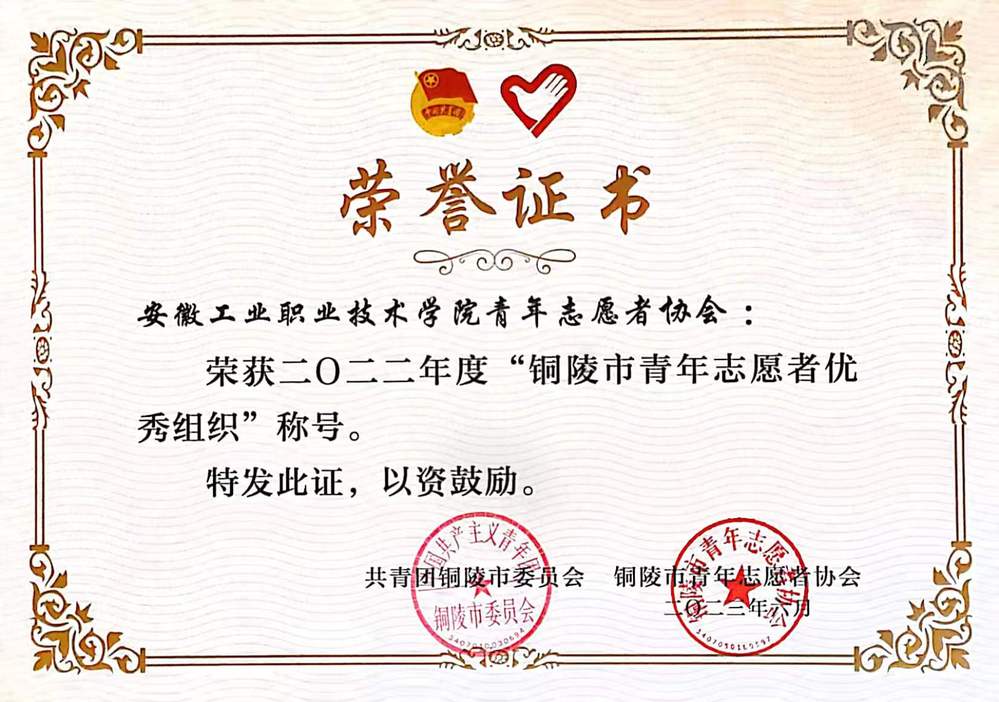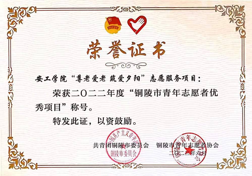 近日,在共青团铜陵市委员会、铜陵市青年志愿者协会下发的《关于表彰2022年度“铜陵市青年志愿者优秀个人”“铜陵市青年志愿者优秀组织”“铜陵市青年志愿者优秀项目”的决定》文件中,学院青年志愿者协会荣获“2022年度铜陵市青年志愿者优秀组织”称号,学院青协负责人马艳华同学获“铜陵市青年志愿者优秀个人”称号,学院青协推报的“尊老爱老 筑爱夕阳”志愿服务项目获“铜陵市青年志愿者优秀项目”称号。