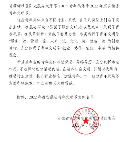 据悉,此次被命名为安徽省青年文明号的青年集体来自不同行业、系统,他们在平凡岗位上创造了突出业绩;在服务群众中弘扬了职业文明;在攻坚克难中展现了青春风采;在改革创新中贡献了智慧力量。忠实践行了青年文明号“服务一流、管理一流、人才一流、文化一流、效益一流”的创建目标,充分体现了青年文明号“敬业、协作、创优、奉献”的精神理念。