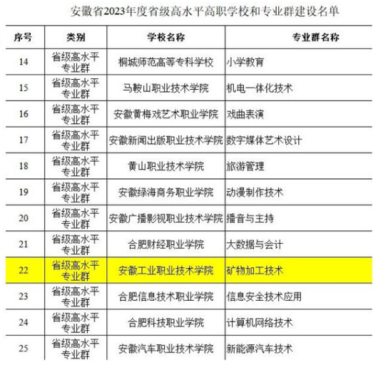 8月3日,安徽省教育厅公布《安徽省教育厅关于公布高水平职业院校和专业群建设名单的通知》(皖教秘高﹝2023﹞103号),beat365矿物加工技术专业群获批立项省级“双高计划”专业群,学院成功入选省级“双高计划”高水平专业群建设单位。