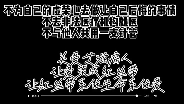 活动以小组为单位,四人一组合作拍摄视频,视频以艾滋病的危害以及如何预防艾滋病为主要内容,讲述了艾滋病的蔓延严重威胁人民群众的生命财产安全,严重威胁着社会的可持续发展,艾滋病的不可治愈性与快速蔓延形势引起了社会各界及各国政府的高度重视等话题。