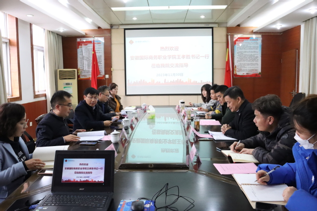 11月30日下午,安徽国际商务职业学院党委副书记、纪委书记王孝胜一行莅临beat365对思政课建设、信访、工会组织建设等工作进行调研交流。学院党委副书记范清义,党委委员、副院长秦华生,办公室、宣传统战部(思想政治理论课教学部)、工会主要负责人和相关工作人员出席此次会议。
