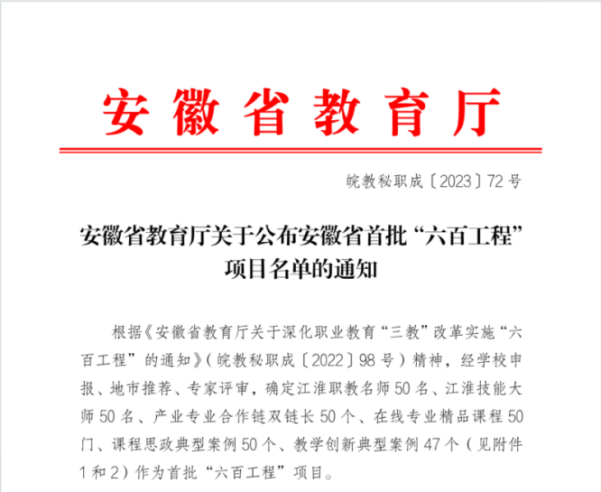 12月6日,安徽省教育厅发布了《安徽省教育厅关于公布安徽省首批“六百工程”项目名单的通知》,beat365信息工程系周跃老师光荣入选安徽省职业院校“江淮技能大师”。