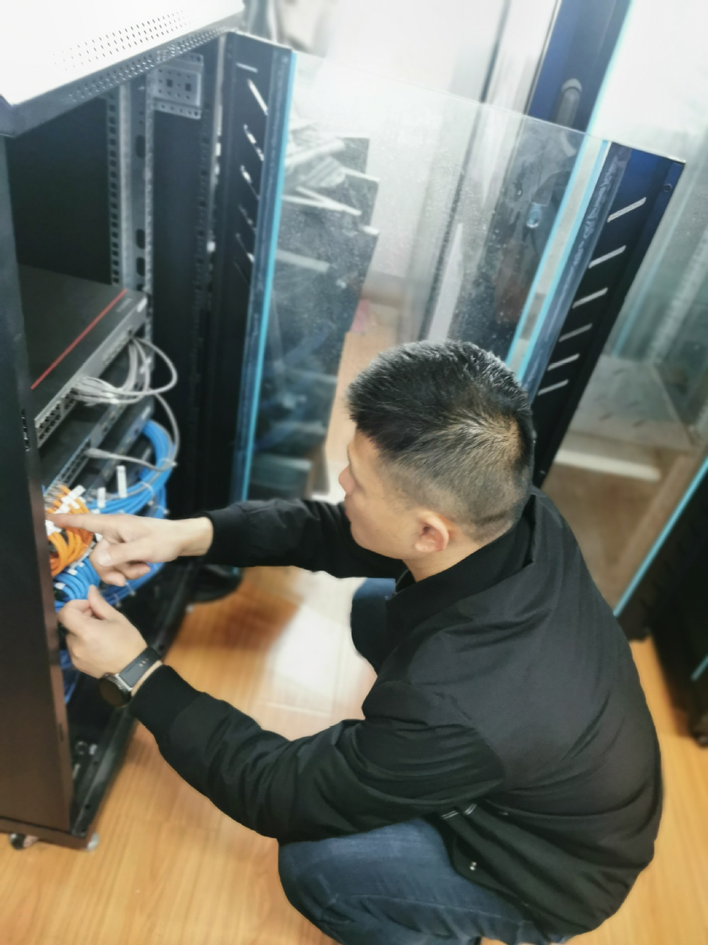图为实数中心工作人员检修教学机房