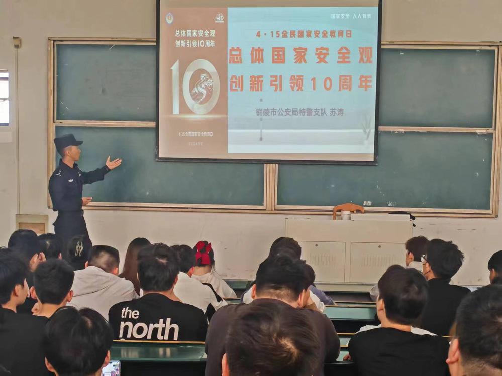 讲座中,铜陵市公安局特警支队一大队二中队民警苏涛向青年学生们讲解了国家安全的含义,带领同学们了解了破坏国家安全的各种恶劣行为,重点阐释了如何树立总体国家安全观、如何维护国家安全以及抵制危害国家安全的行为,让国家安全教育深植到每一位青年学生心中。