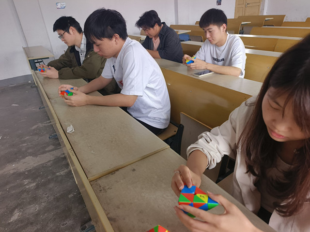 为了激发同学们对数学的热情及学习兴趣,4月20日下午2:30,学院应用数学社团在天井湖校区教学楼401教室成功举办“金字塔魔方”竞赛活动。本次活动由社团指导老师指导,社长、副社共同组织,一共13位同学参与本次活动。