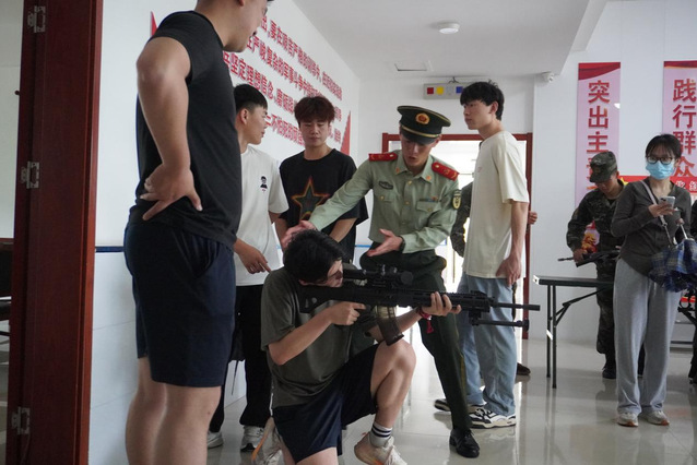 在随后的枪械展示环节中,同学们热情高涨,各式各样的武器让同学们眼前一亮,这些曾经只在电影电视中看过的武器现如今静静的放在面前,同学们端枪瞄准跃跃欲试,纷纷合影留念。