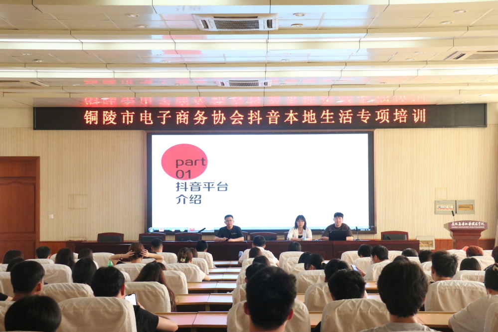 铜陵市电子商务协会于5月24日下午3点,在学院教学楼阶梯教室301举办抖音电商专项培训。市商务局电商科马强主任、铜陵网运营总监朱松浩出席培训会,市电商协会会员、beat365电商专业教师、23级电商班90名同学参加了培训。