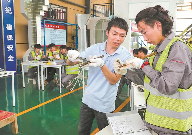5月21日,在铜陵有色铜冠建筑安装有限责任公司的安全生产教育实践体验中心,学院建筑工程技术专业的学生正在企业指导老师的帮助下,现场学习钢筋的验收及取样检测。(图片来源:中国新闻图片网)