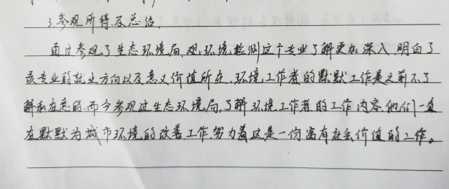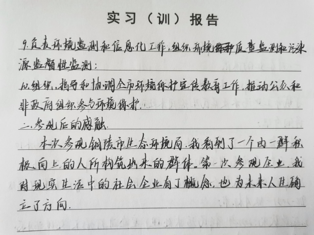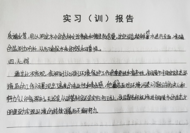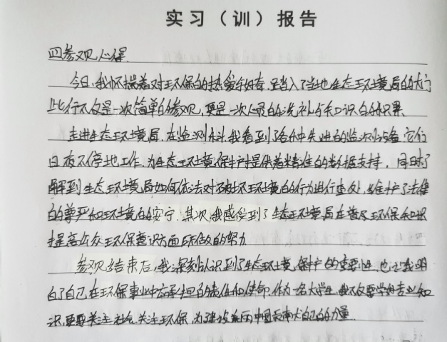 参观学习后,学生还撰写了实训报告,报告详细总结了实训期间的所学所感,学生们纷纷表示此次学习不仅开阔了眼界,也看到了环保事业的重要性和环保人的辛勤付出,更加坚定了未来从事环保工作的信心和信念。(撰稿:王小英 审核:杨书怀)