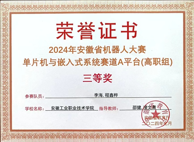 近日,备受瞩目的2024年安徽省机器人大赛圆满降下帷幕。在这场汇聚了全省顶尖科技智慧的盛会上,机电工程学院在单片机与嵌入式系统赛道A平台(高职组)中脱颖而出,再次书写辉煌篇章,一举夺得二等奖1项及三等奖3项的卓越佳绩。