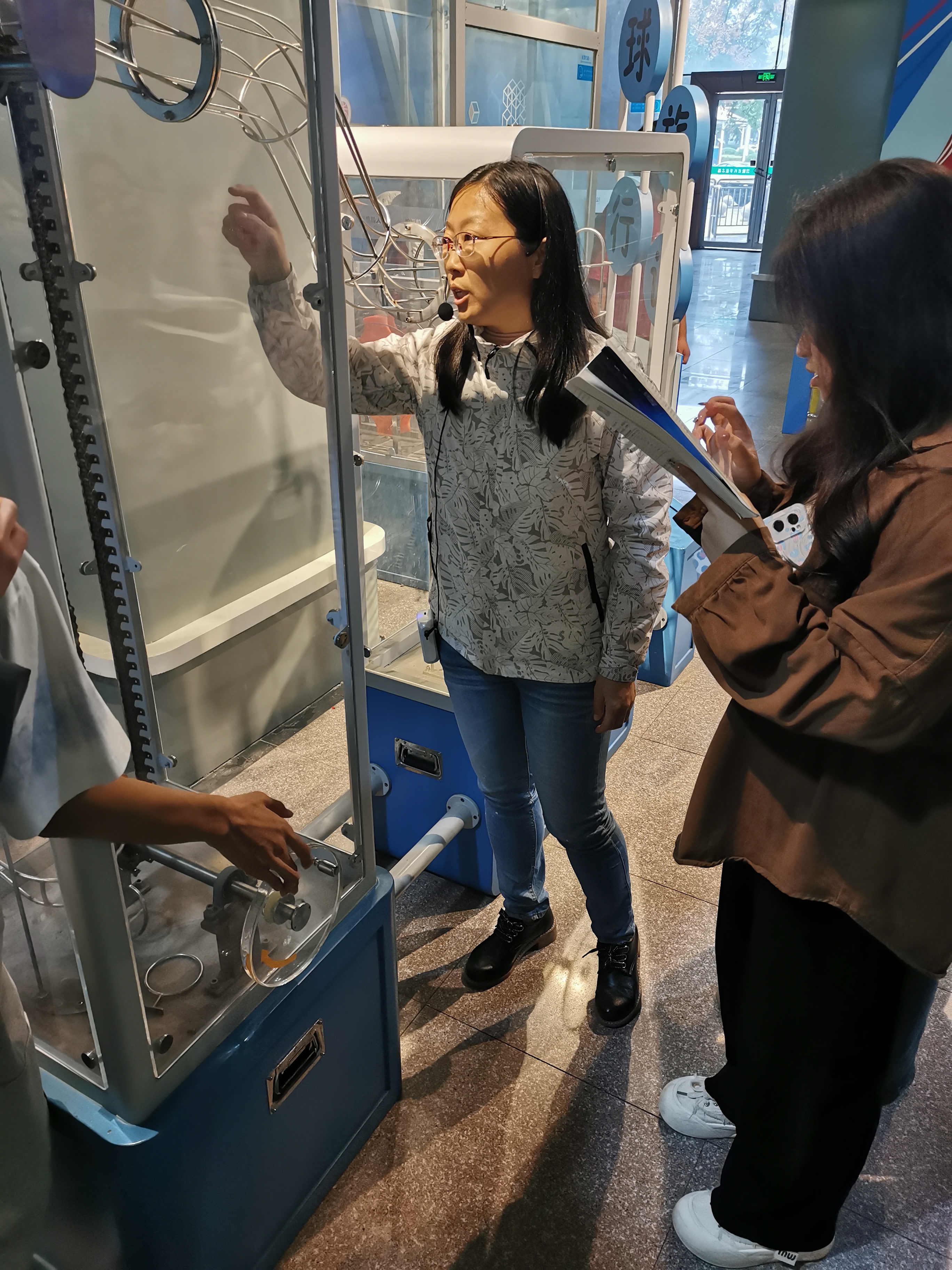 在本次参观学习的重点“小球旅行记”展区,王老师一边带领学生动手操作,一边提问学生相关问题,并对一些细节进行补充。通过实际操作,真正做到理实结合,学生充分理解和掌握了课堂上介绍的几种常见的传动方式。