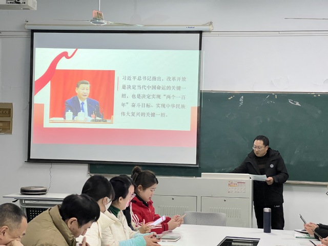 12月25日,机电工程学院党支部于S北509教室举办了一场主题为“学习贯彻党的二十届三中全会精神”的党课。本次党课旨在引导支部党员深入学习领会习近平总书记在全会上的重要讲话精神,全面准确理解《决定》提出的进一步全面深化改革重大举措,全力以赴抓好全会精神的贯彻落实。