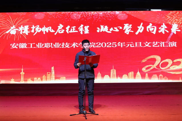 学院党委书记范清义致新年贺词。他首先代表学院向一年来辛勤耕耘在教学、管理、服务等各条战线的全体教职员工,向认真学习、蓬勃向上的各位同学,致以最美好的新年祝愿!他指出,2024年,是学院蓄势谋发、达标赶超的关键一年,全院师生员工在党的二十大、党的二十届三中全会精神和习近平总书记考察安徽重要讲话精神的指引下,内强素质、外塑形象,取得了可喜的成效,成绩斐然,期盼已久的新校区建设项目今天正式开工建设。2025年,我们仍需坚定立德树人的初心使命,坚守培根铸魂的职业信仰,全院师生要以新校区和高水平专业群建设为契机,以更加饱满的热情、坚定的信念、扎实的行动,坚韧的毅力,同心、同向、同行,共同书写属于我们全体安工人的新的精彩篇章!