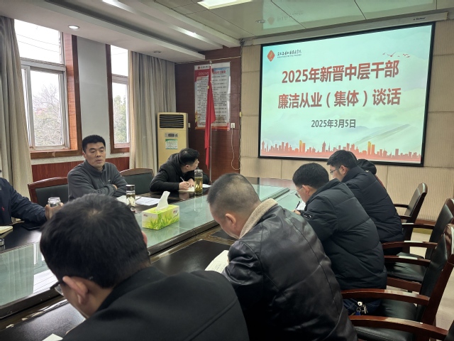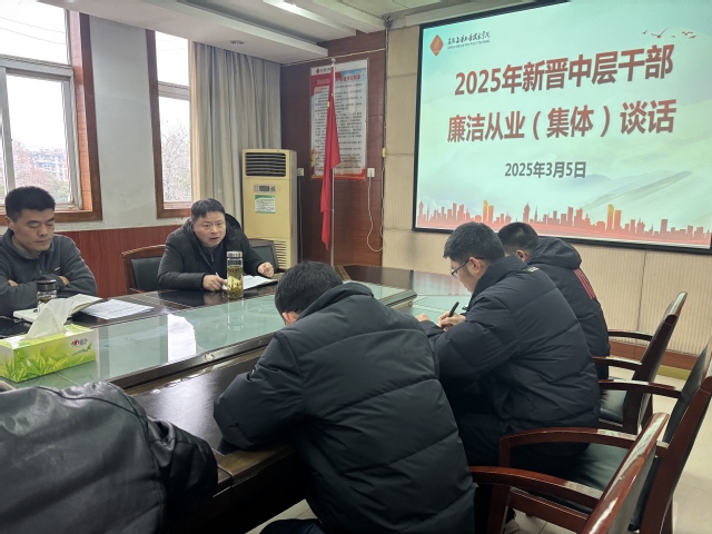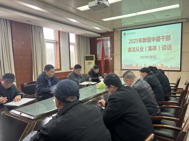 3月5日上午,学院在第一行政楼四楼会议室召开2025年学院新晋中层干部廉洁从业(集体)谈话会议。学院党委书记范清义,党委副书记、工会主席黄仕银,党委委员、纪委书记罗海峰,纪委副书记以及新提拔的6名中层干部参加会议。会议由黄仕银主持。