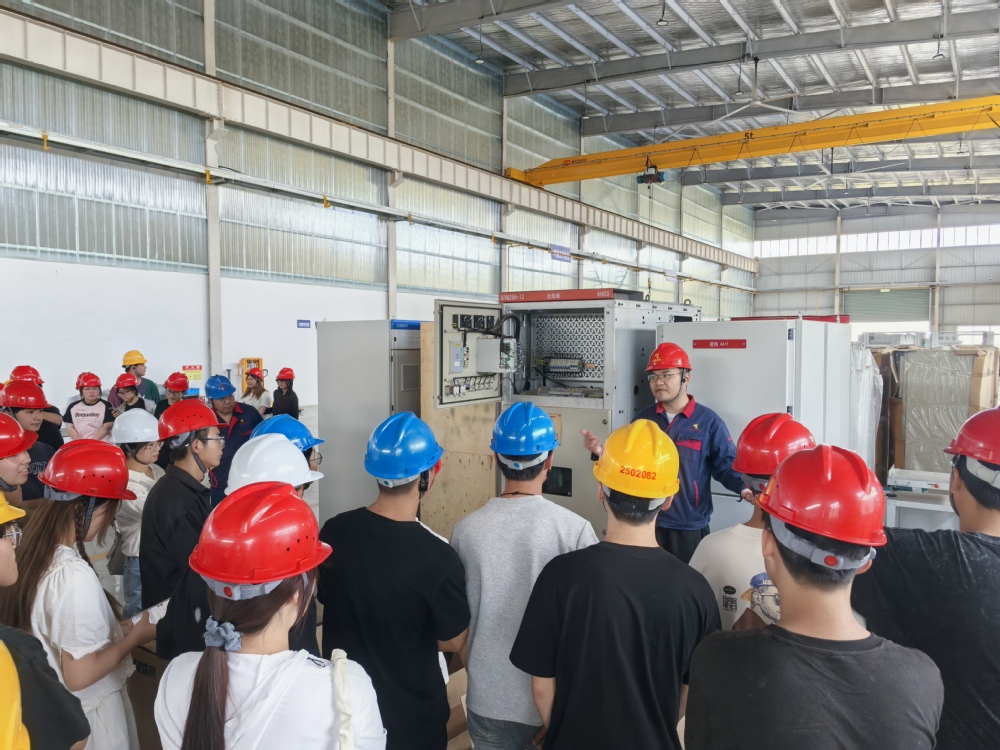 在电控设备厂中,高级管理人员向学生们展示了高低压电控设备的线路连接、组装流程,并详细讲解了自动化设备出厂前的试验流程及其原理,使学生们对电控设备有了更为直观的理解。