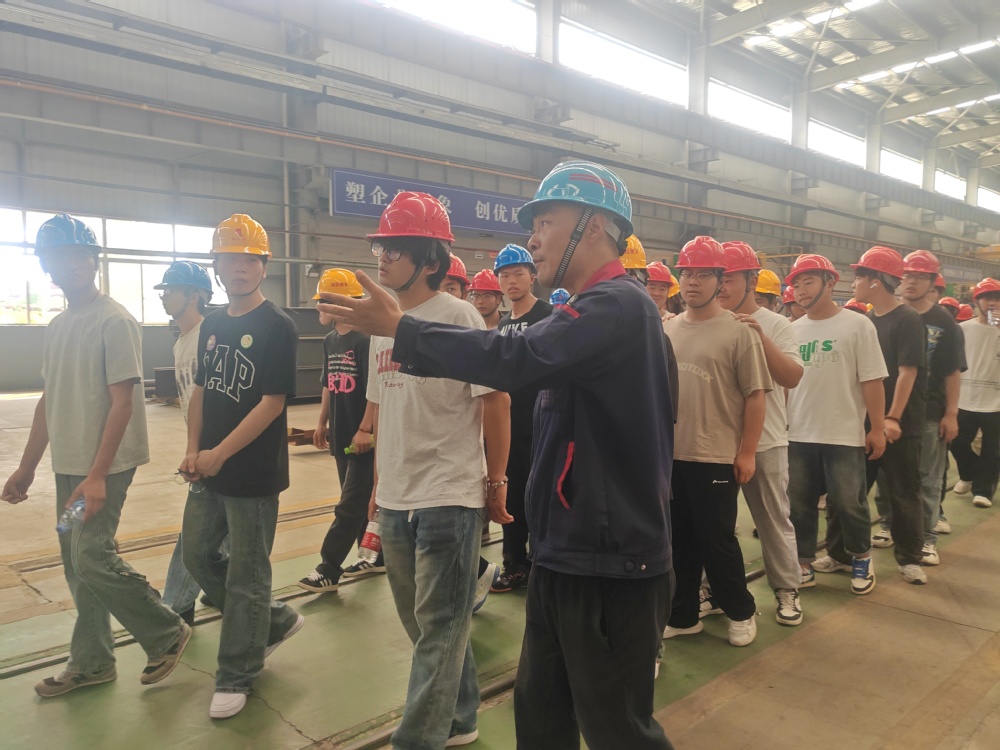 随后,师生一起走进钢结构生产线,近距离感受建筑工业的创新发展。从原料分类、数控切割到构件架立、焊接组装,整个生产流程尽收眼底。谢主任详细介绍了钢结构技术在现代建筑中的广泛应用及其发展趋势,特别展示了数控切割机的精准作业和焊接机器人的智能化操作。现场飞溅的焊花和工人专注的操作,生动诠释了建筑工匠精神的时代内涵。