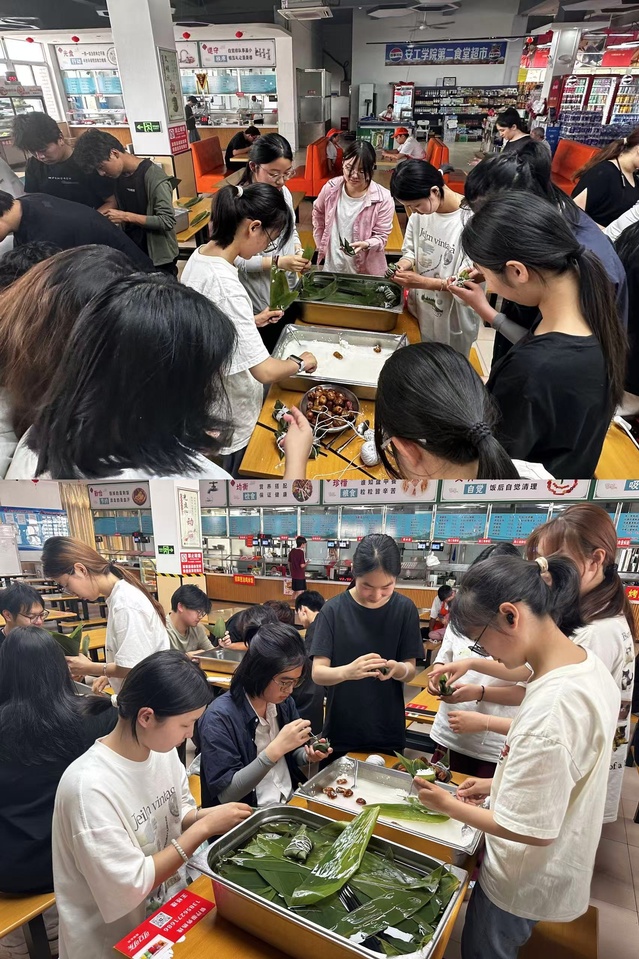 活动中,学院新疆派驻教师、团委副书记何老师致辞,向同学们送上节日问候,强调民族团结与文化传承意义。何书记通过故事讲述,详细介绍端午节起源、赛龙舟、挂艾草等习俗及各地粽子特色。烹饪专业同学现场示范包粽技巧,从粽叶处理到糯米调味、粽子包扎,同学们分组实操,在指导老师与志愿者协助下,亲手包制粽子,现场氛围热烈。