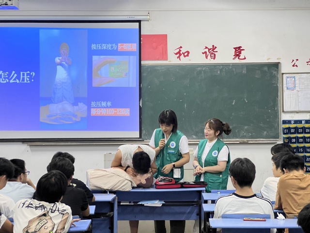 在互动环节,五名同学踊跃上台进行急救技能演示。在聂娜老师的悉心指导下,他们依次展示了心肺复苏操作流程,从判断患者意识、呼救、调整体位,到胸外按压、开放气道、人工呼吸等步骤,动作规范、默契配合,赢得了现场阵阵掌声。