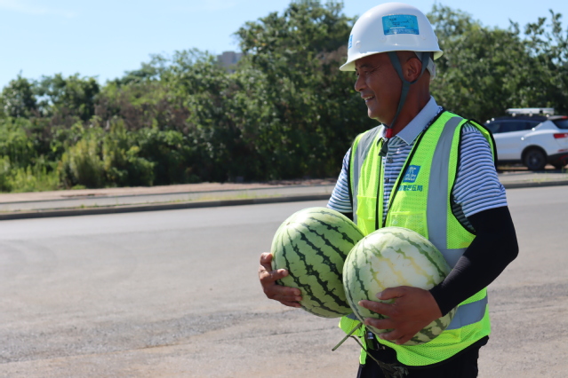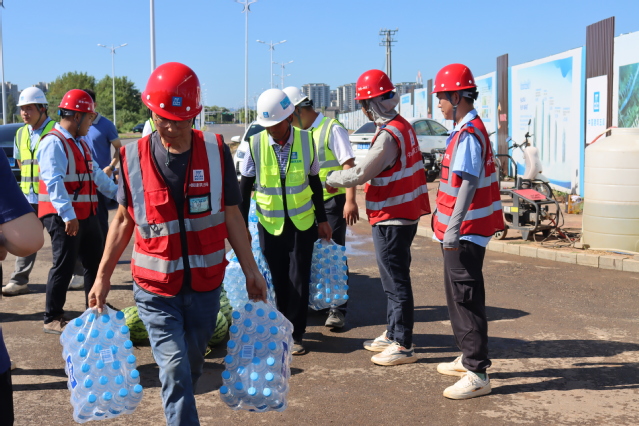 在施工现场,学院领导详细了解了新校区的工程进展、安全生产及防暑降温措施落实情况,对施工人员顶烈日、战高温的辛勤付出表示感谢,叮嘱大家在确保工程质量和进度的同时,注意劳逸结合,做好自我防护。随后,学院领导向工人们发放了西瓜、矿泉水、冰红茶等防暑物资,让一线建设者感受到学院的关怀。