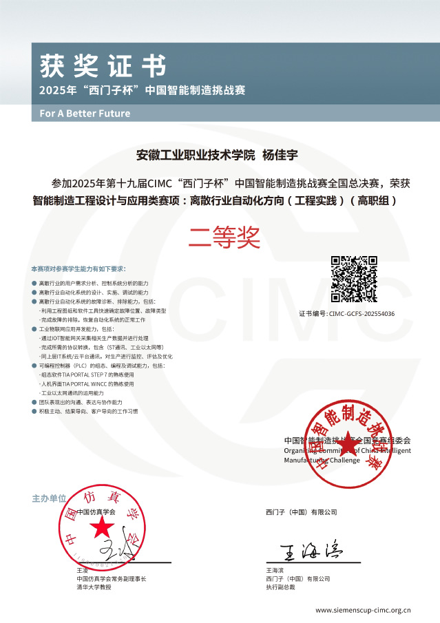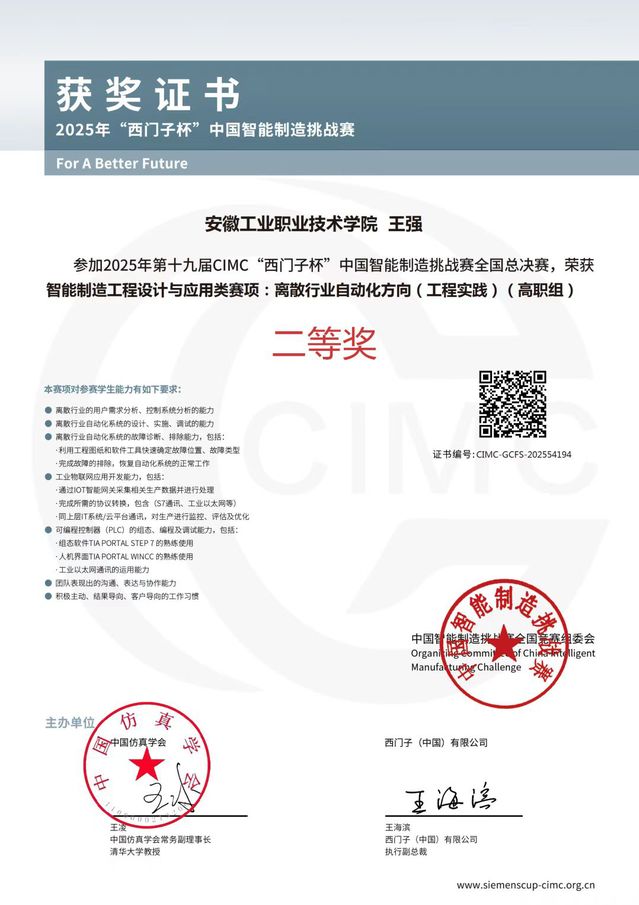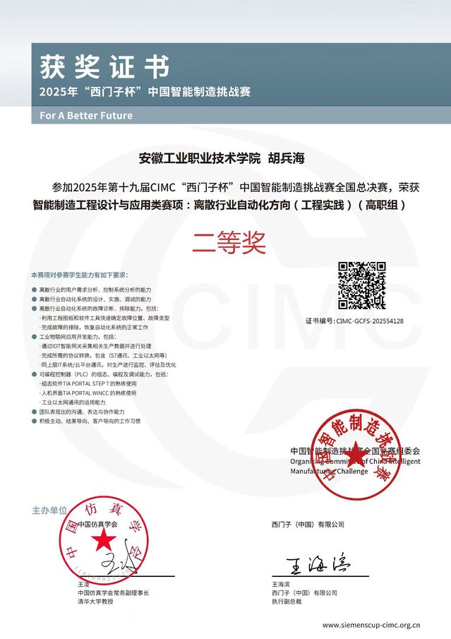 “西门子杯”中国智能制造挑战赛是我国智能制造领域规模最大、规格最高的A类学科竞赛,面向全国控制科学与工程、电气工程等相关学科的研究生、本科生和高职学生,旨在推动智能制造前沿技术与工程实践深度融合,培养高素质复合型工程技术人才。