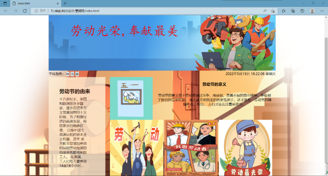 劳动其实可以分为很多种类型,相较于体力劳动,脑力劳动也是我们日常生活中必不可少的工作。借劳动教育宣传周活动为契机,开展一次《五一“劳动最光荣”静态网页设计》活动竞赛,可以让同学们积极运转大脑,消化一下所学到的知识,并应用到实际中来。部分作品展示如下: