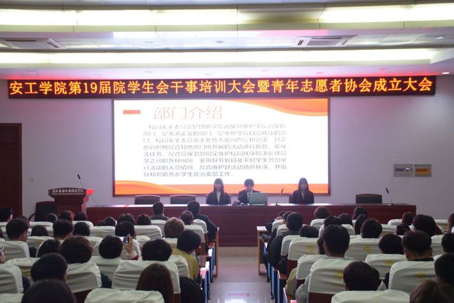 为了更好地推进学院学生会各项工作,加强学生会队伍建设,11月23日,学院团委在阶梯201教室召开安工学院第19届院学生会干事培训暨青年志愿者协会成立大会。