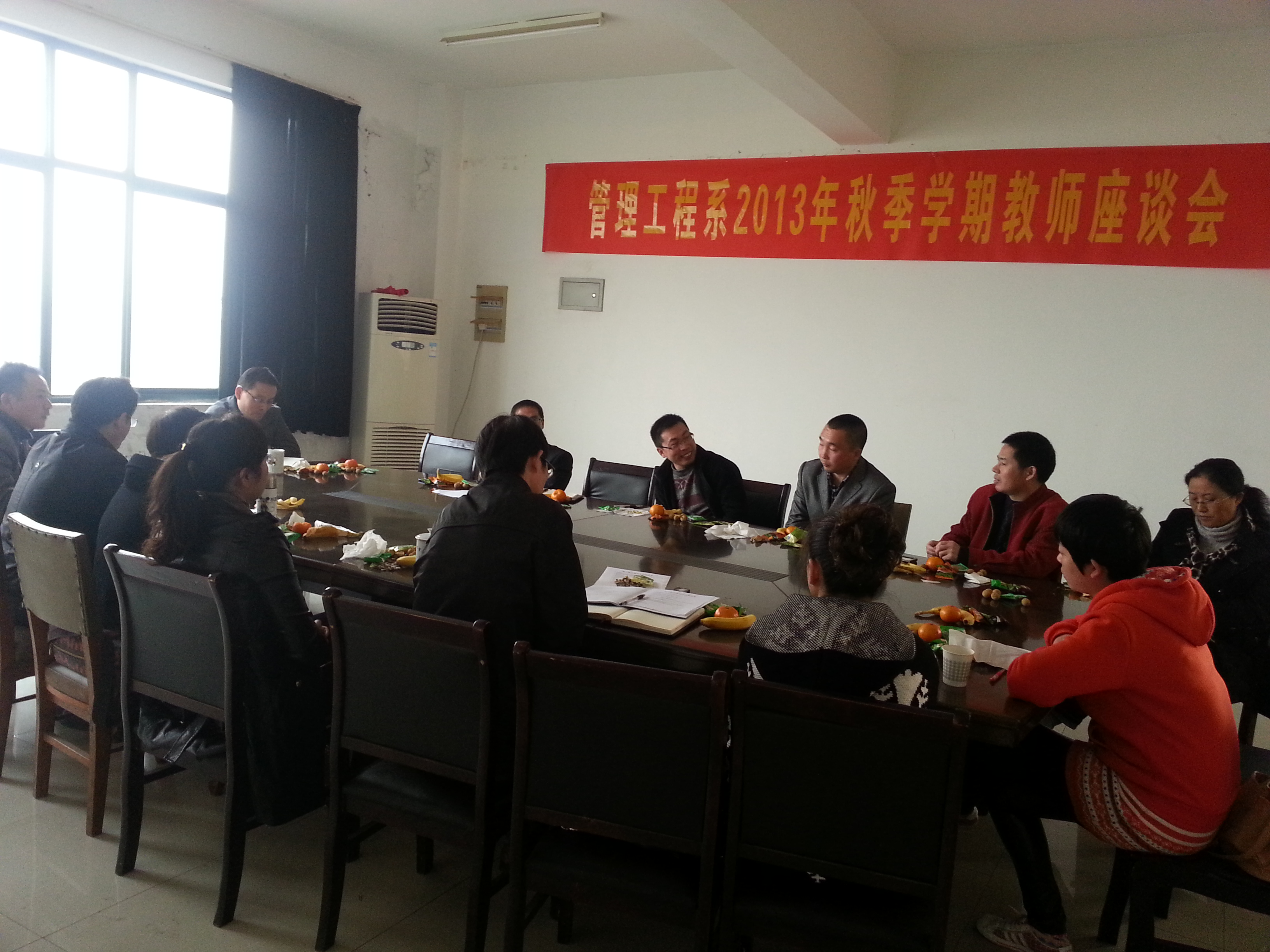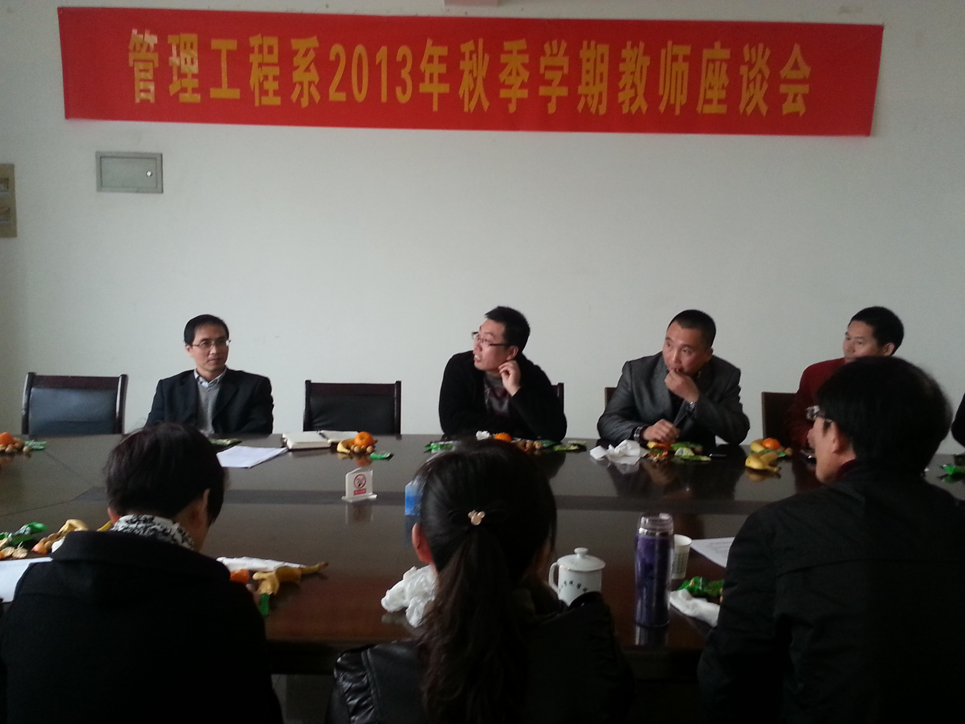 根据学院的统一部署,我系于2013年11月22日下午3:30在实训楼大会议室举行了管理工程系教师座谈会,管理系支部书记汤大益同志、副主任刘汉周同志及管理系全体专兼职老师参加了会议。