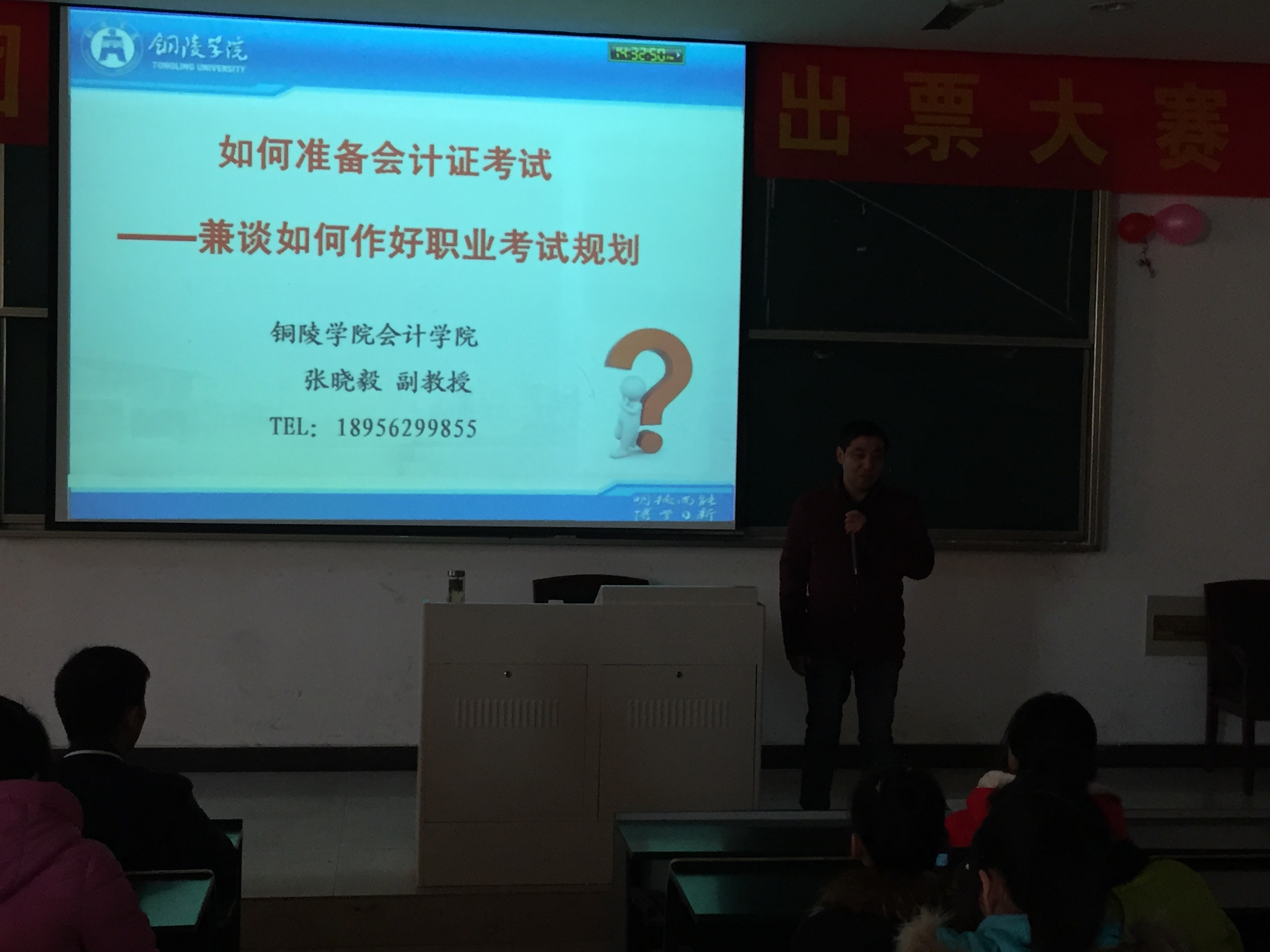 为了加强我系会计专业学生的考证教育,十二月十八日下午我系特邀请铜陵学院张晓毅副教授在阶梯101教室举办了一次关于会计考证知识的讲座,讲座面向15级会计专业全体同学。 张教授以风趣幽默、深入浅出的演讲风格解读了会计专业的各种等级考试的相关政策,生动细致地介绍了他们多年来复习迎考的工作经验及备考注意事项,为我系会计专业学生的考证工作提供了强有力的支撑。
