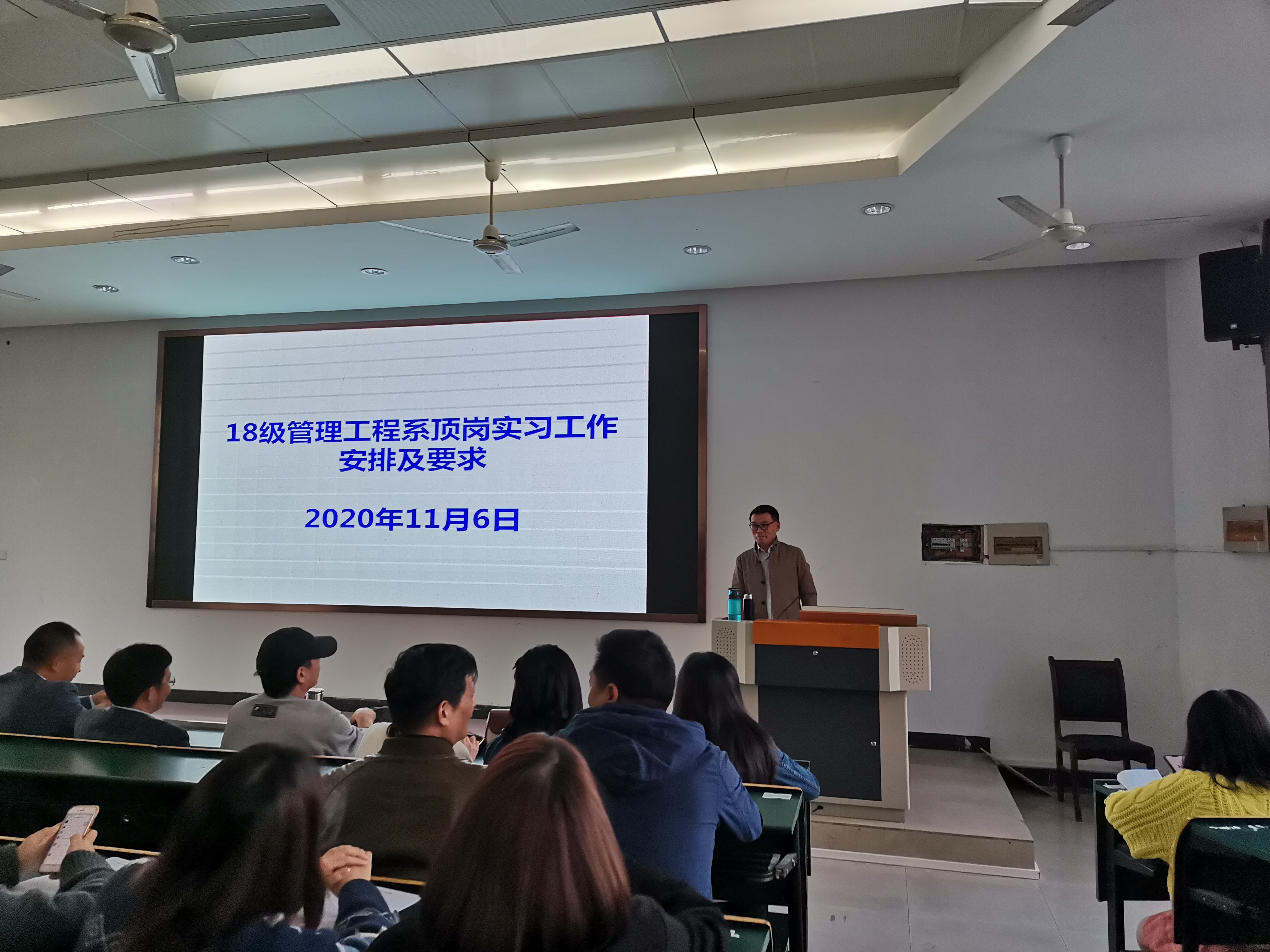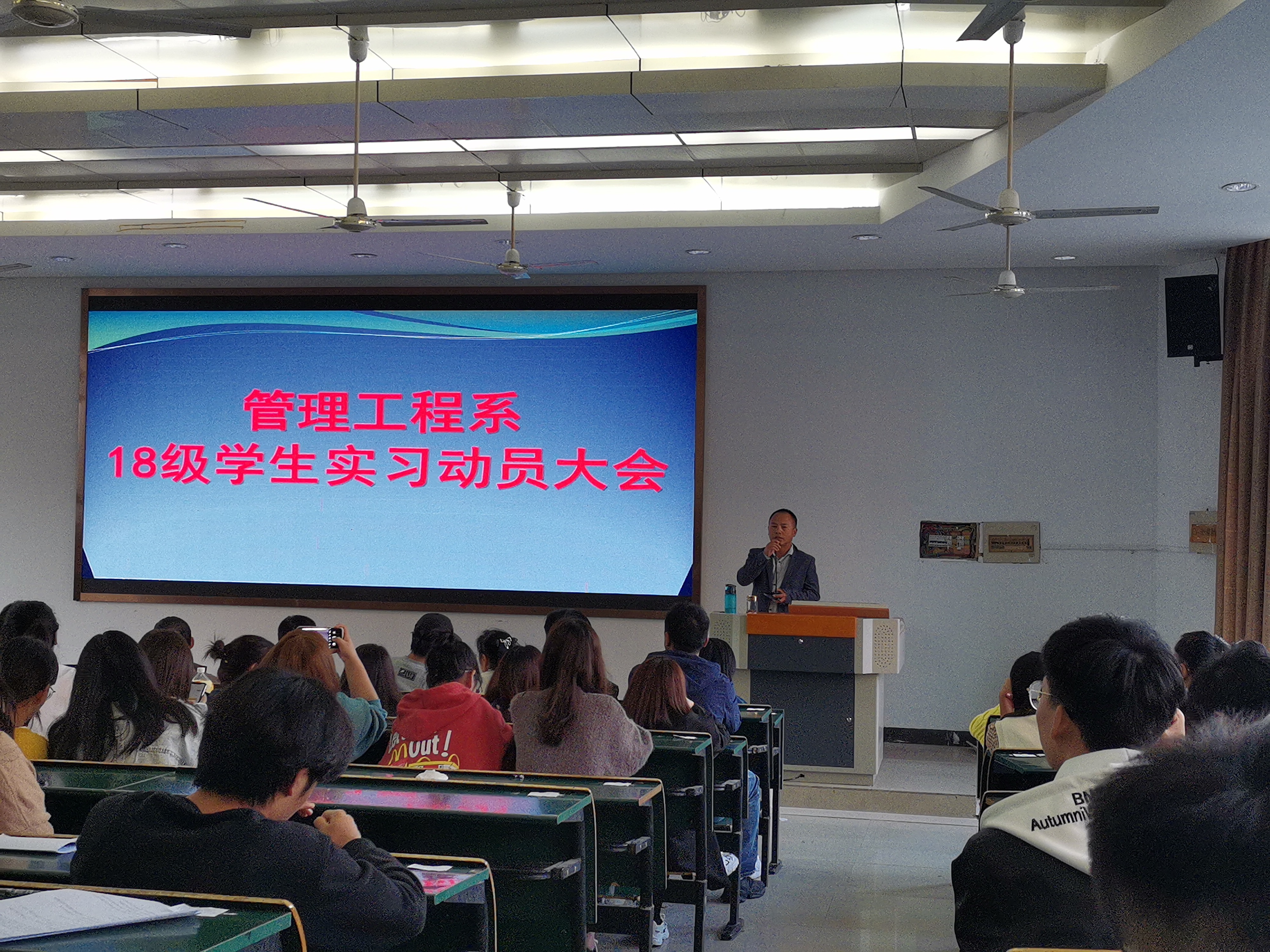 为加强学生对顶岗实习的认识和了解,11月6日下午四点,管理工程系在阶梯教室101召开2020年顶岗实习动员大会,会议由管理工程系副主任刘汉周主持,全体指导教师、辅导员及18级学生参加了本次会议。