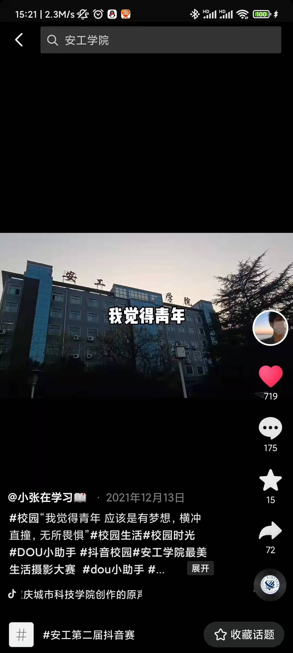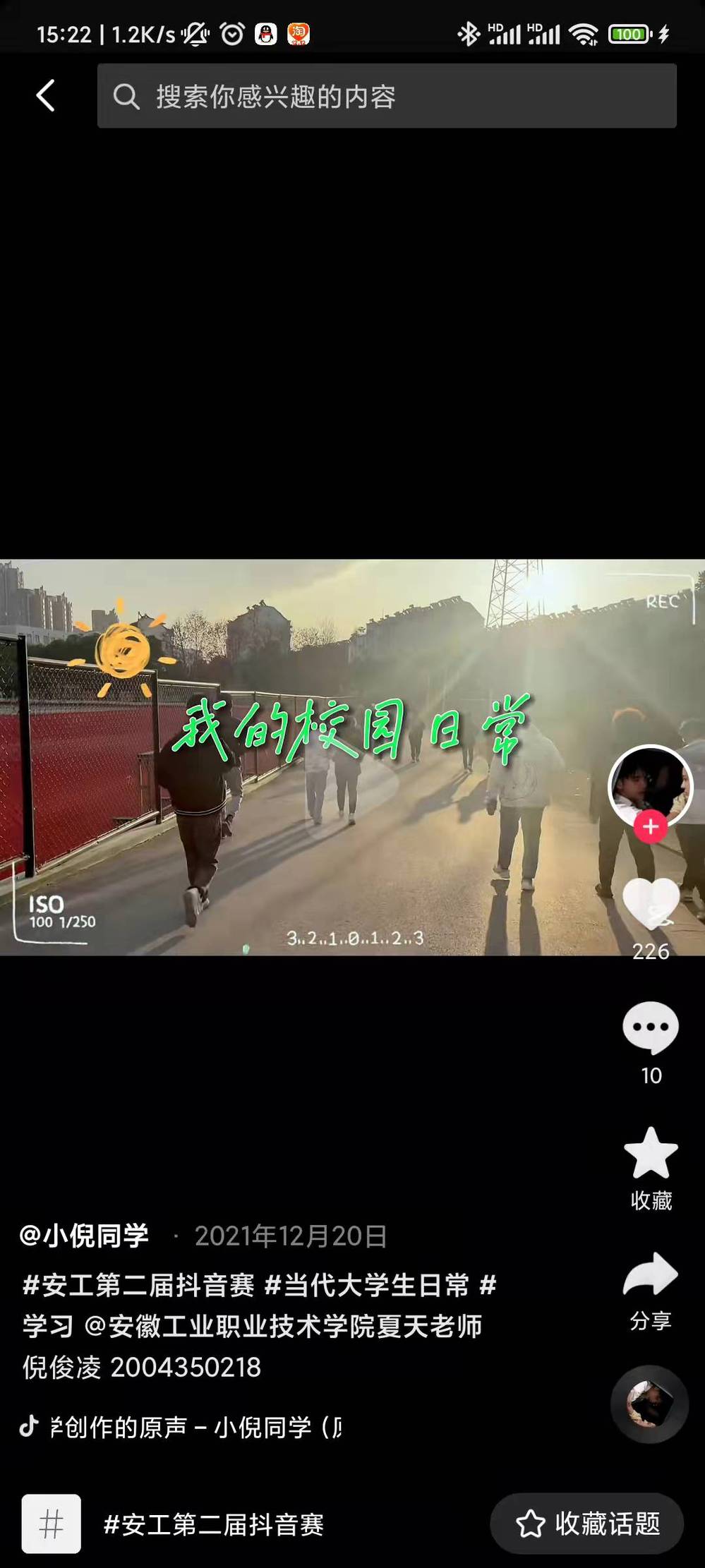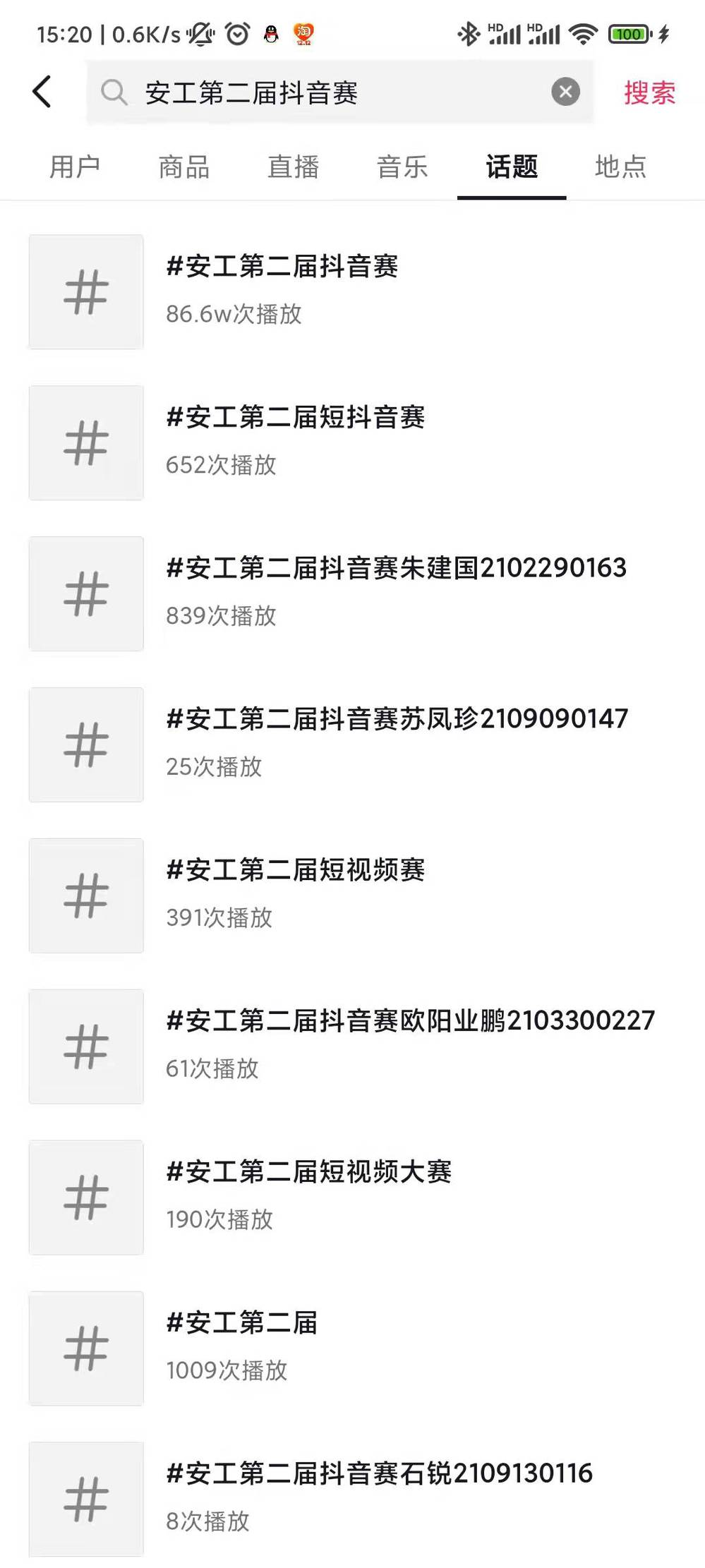 活动一发起,迅速吸引了全校同学积极参加,本次抖音大赛共有近500名同学参加,“安工第二届抖音赛”话题达到86.6万次播放。各参赛作品都是原创,经过同学们后期精心裁剪制作而成。每个作品都是同学们爱国爱校爱生活的剪影,也是同学们践行社会主义核心价值观的文化干货。本次比赛由管理系夏鹏宇、吴涛老师作为评委,按照评分细则确定获奖同学,具体获奖名单如下。