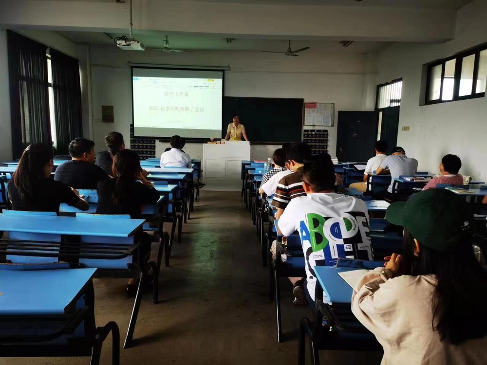 2022年9月2日下午,管理工程系在实训楼北503教师召开了2022年秋季学期教职工大会暨教学工作会议。会议由管理系副主任吴涛主持,管理系主任曹有智、书记胡静、管理系教师和行政坐班人员参加了会议。