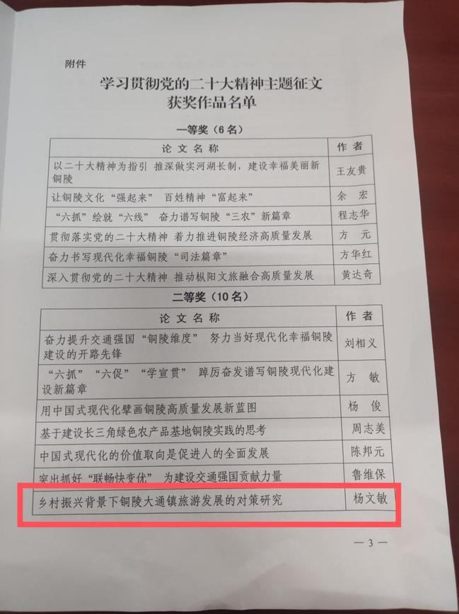 近日,在市委宣传部、市社科联、铜陵日报联合开展的“学习贯彻党的二十大精神”主题征文活动中,管理工程系杨文敏老师的论文《乡村振兴背景下铜陵大通镇旅游发展的对策研究》获得二等奖。