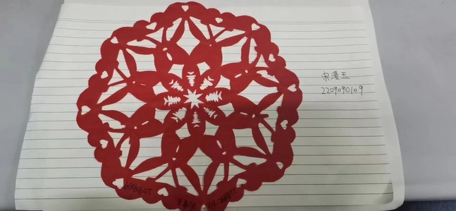 图片里我们看到的就是学生们用手和剪刀的配合灵巧性,和动手能力,一张张彩纸在学生们手里面改的游刃有余,活动成果展示是丰富多彩的里面有动物,我们中国春节的象征,植物、雪花、装饰图等各个方面。