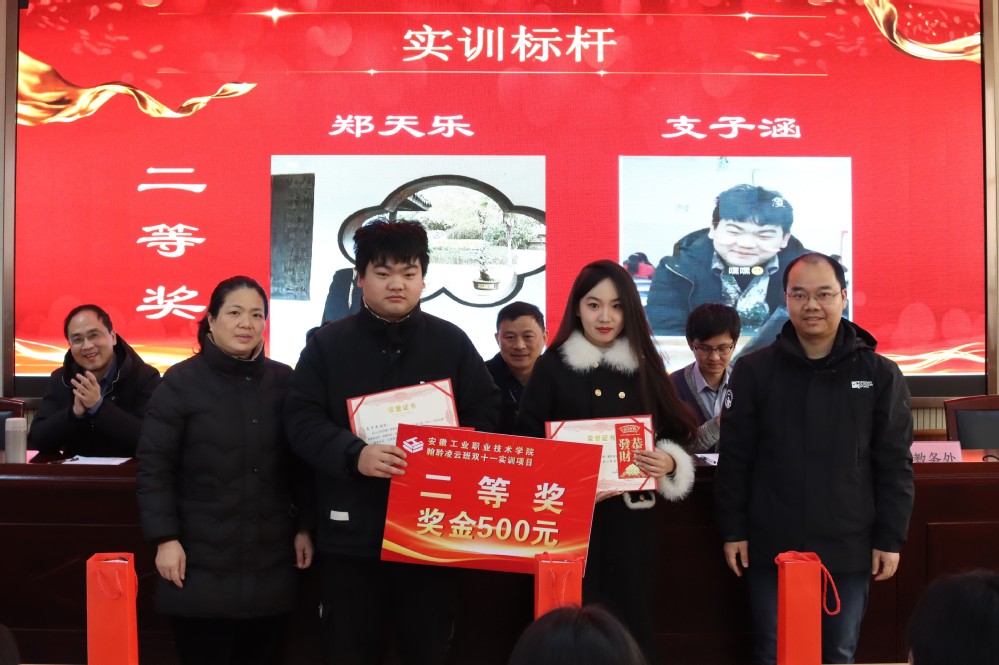 参会领导和企业负责人共同为实战实训期间表现优异的10名同学颁发了奖状和奖金,为凌云班的每位同学发放了实训纪念品冬季暖心保温杯。