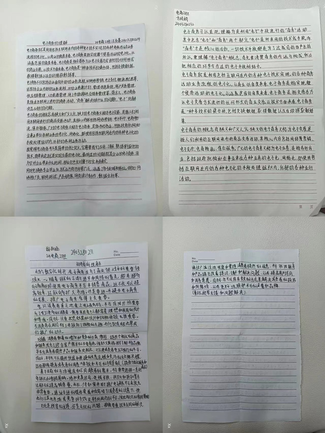 在收到的征文中,同学们展现出了对电商领域的深刻洞察。既有对电商基本概念和原理的清晰阐释,也有基于实际案例的深度剖析;既有对传统电商模式的反思,也有对直播带货、跨境电商、社交电商等新兴趋势的独到见解。同学们的用心创作,充分体现了电子商务在当今经济社会中的重要地位和快速发展态势。